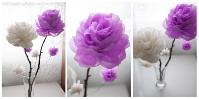 Tämmöisiä askarrellut töissä ja kotona. Innostuin kun työparini oli lupautunut tekemään naistenpäiväksi työntekijöille (naisille) kukat rintaan. Auttelin kukkien tekemisessä ja halusin tehdä kotiinkin kukkasen. Metsästä löytyy läjäpäin tippuneita oksia varsiksi, tulee paljon kivemman näköinen kuin suorasta keppivarresta. Jos haluaa vihreän varren, voi toki kieputtaa vihreää kreppipaperia oksan ympärille, mutta omasta mielestä varsi on nätimpi tuollaisenaan. Valkoisessa kukassa on myös hilettä tuomassa vähän säihkettä. (ei kylläkään näy kuvassa) Kiva pieni sisustuselementti kotiin :)